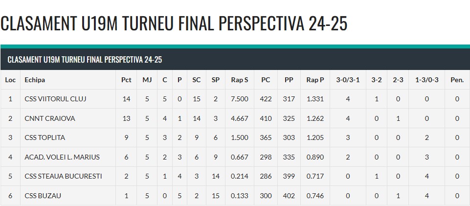 Echipa CNNT Craiova, antrenată de Daniela Căpățânp, a încheiat Turneul Final Divizia U19 M – Perspectivă, desfășurat la Toplița, pe locul 2 național, la doar un punct distanță de CSS Viitorul Cluj-Napoca. După cinci meciuri de foc, băieții voleibaliștii craioveni au obținut patru victorii cu scorul de 3-0 și au pierdut un singur meci, cu 3-2, chiar în fața echipei clujene.